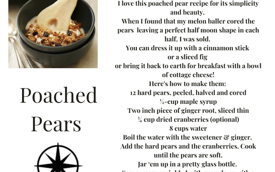 I love this poached pear recipe for its simplicity and beauty. When I found that my melon baller did a perfect job of coring the pears and leaving a perfect half moon shape in each half, I was sold. You can dress it up with a cinnamon stick or a sliced fig or bring it back to earth for breakfast with a bowl of cottage cheese!